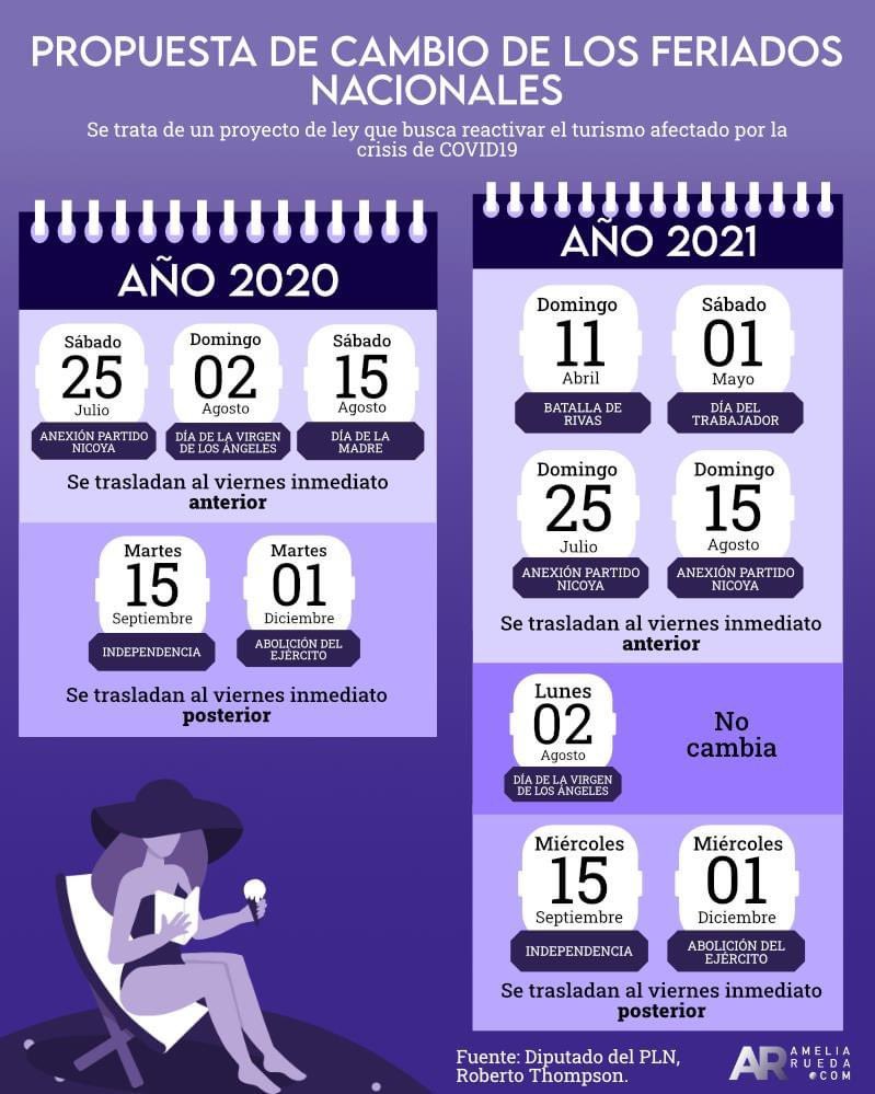 El día de hoy 2 de julio la Asamblea Legislativa aprobó en segundo debate el proyecto de Ley 21941 el cual busca fomentar la reactivación del turismo como. DÍAS FERIADOS 2021 COSTA RICA TRASLADADOS A DÍAS LUNES. CP-015-2021 MTSS 25 de julio es feriado de pago obligatorio mientras que el 2 de agosto es de pago NO obligatorio.